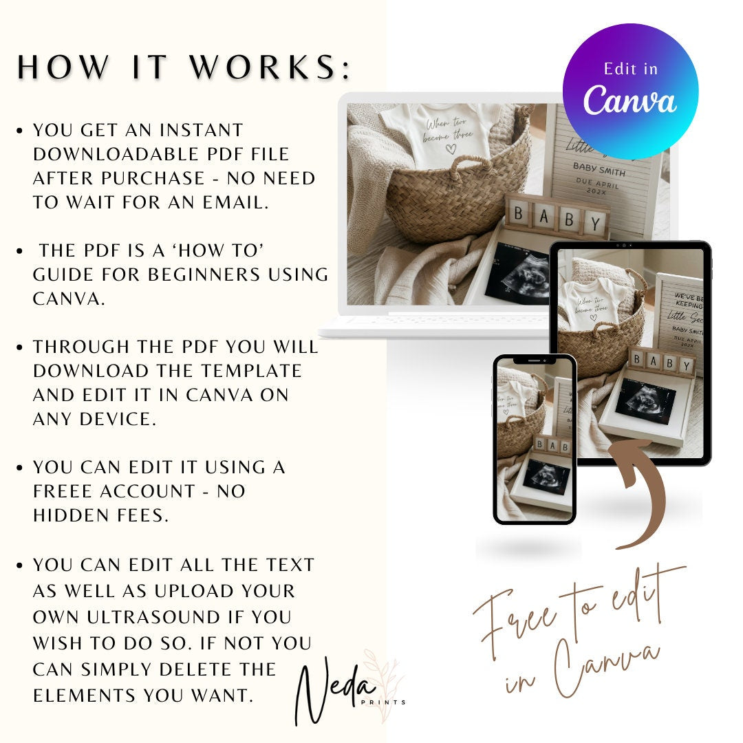 You're pregnant, how exciting!! It's time to share the news with friends and family and this baby announcement mockup is the cutest and quickest way to so. The template is made in Canva so all you need to do is create a free account and your ready to edit your invite.