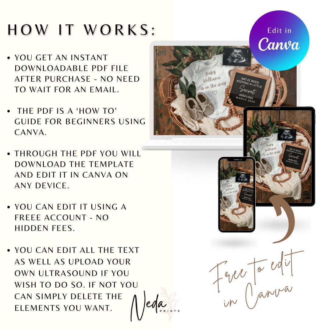 You're pregnant, how exciting!! It's time to share the news with friends and family and this baby announcement mockup is the cutest and quickest way to so. The template is made in Canva so all you need to do is create a free account and your ready to edit your invite.