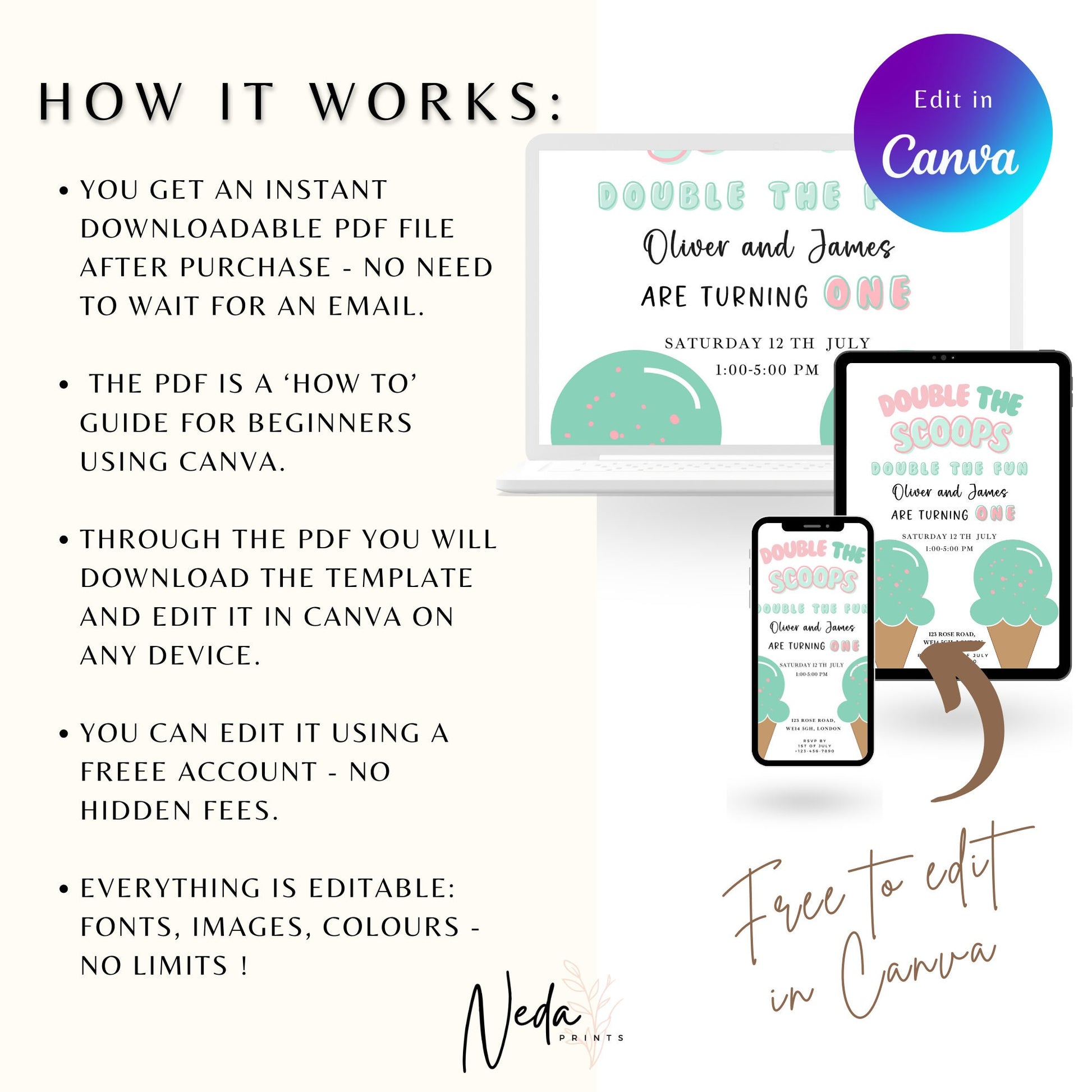 EDITABLE Twin Girl Summer Ice Cream Birthday Invitation, Ice cream party, Here's the scoop 1st twin Birthday Invite Printable Template I0064