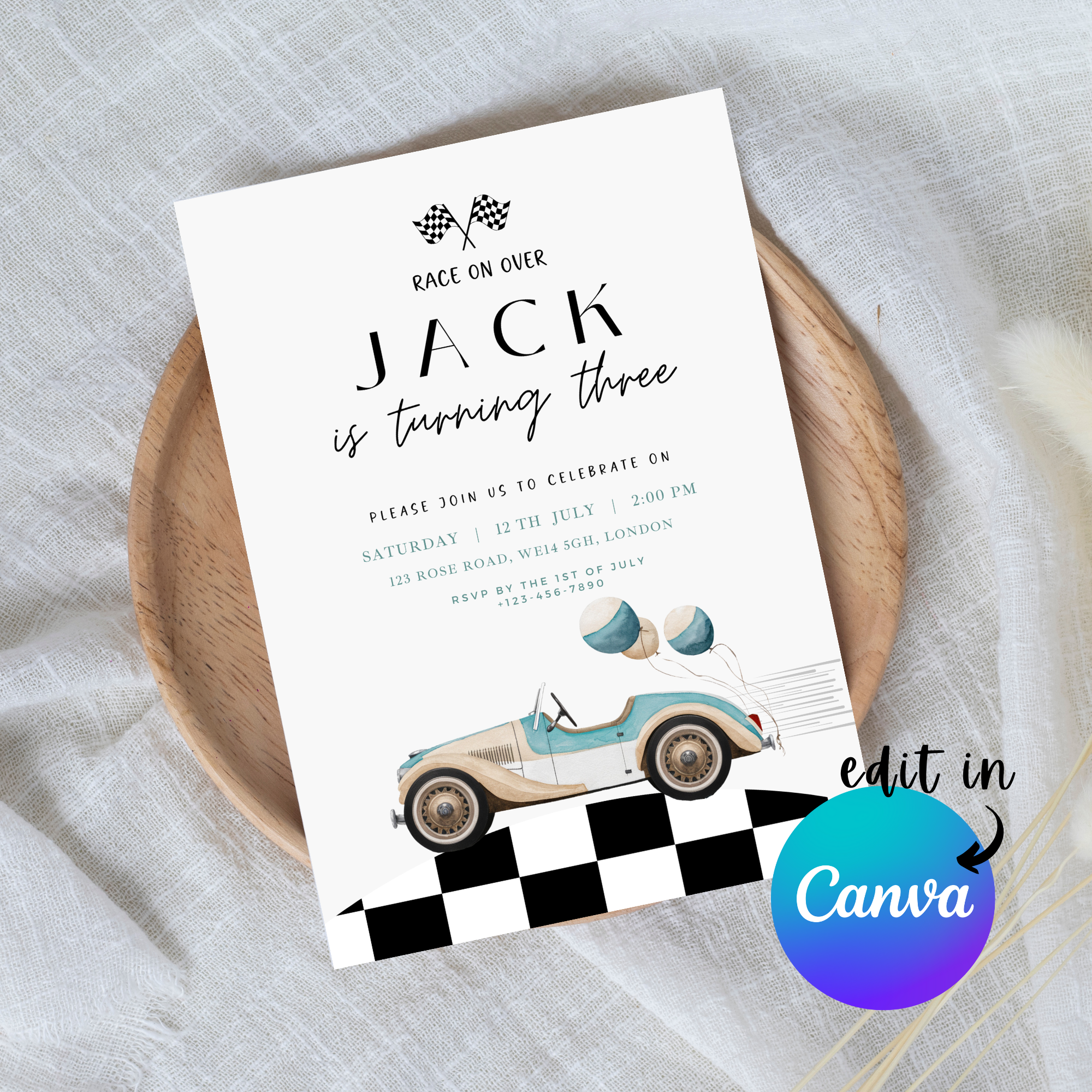 EDITABLE Retro Checkered Race Car 1st Birthday Invitation, Race car birthday invite,, Fast one invitation, First Birthday, Instant Download
