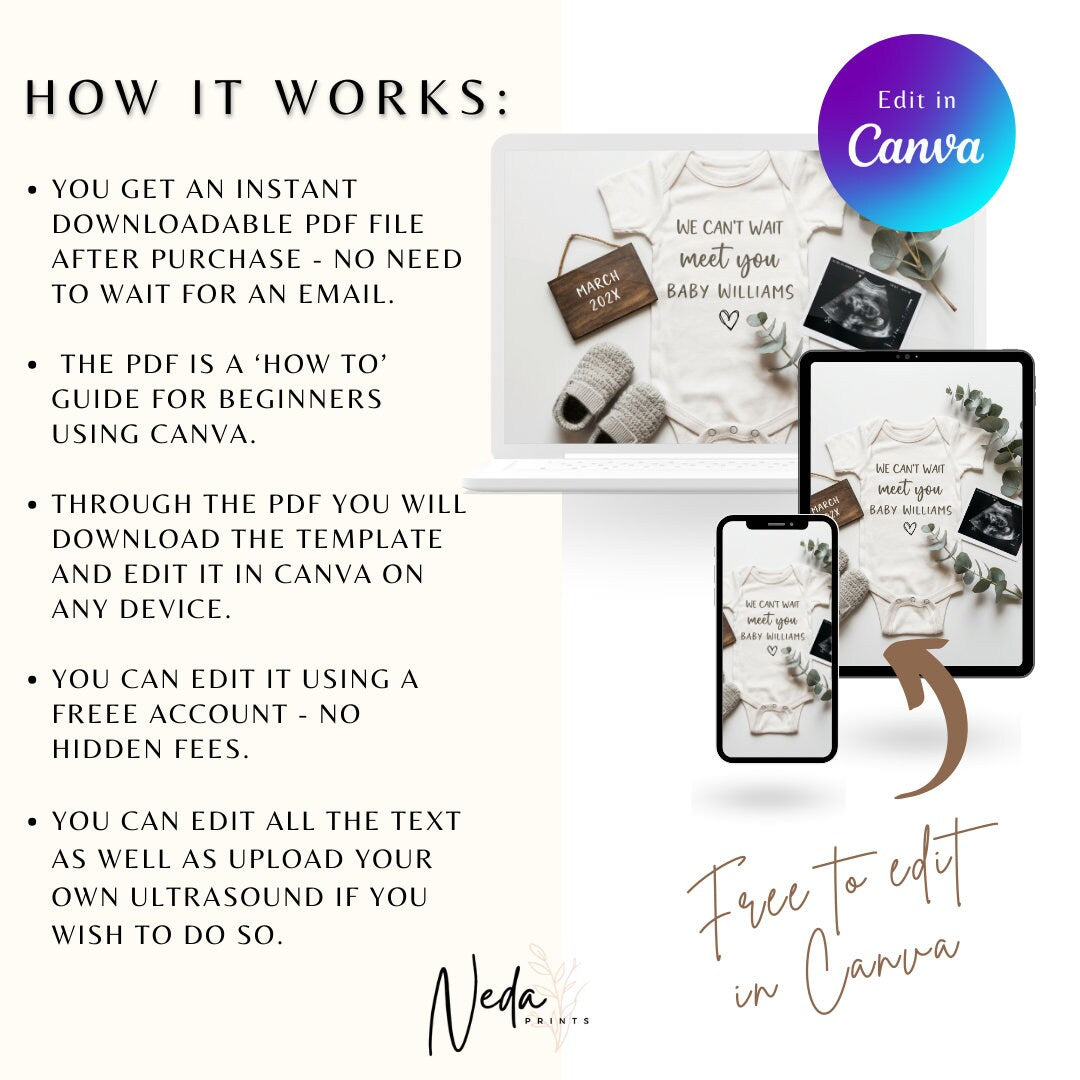You're pregnant, how exciting!! It's time to share the news with friends and family and this baby announcement mockup is the cutest and quickest way to so. The template is made in Canva so all you need to do is create a free account and your ready to edit your invite.