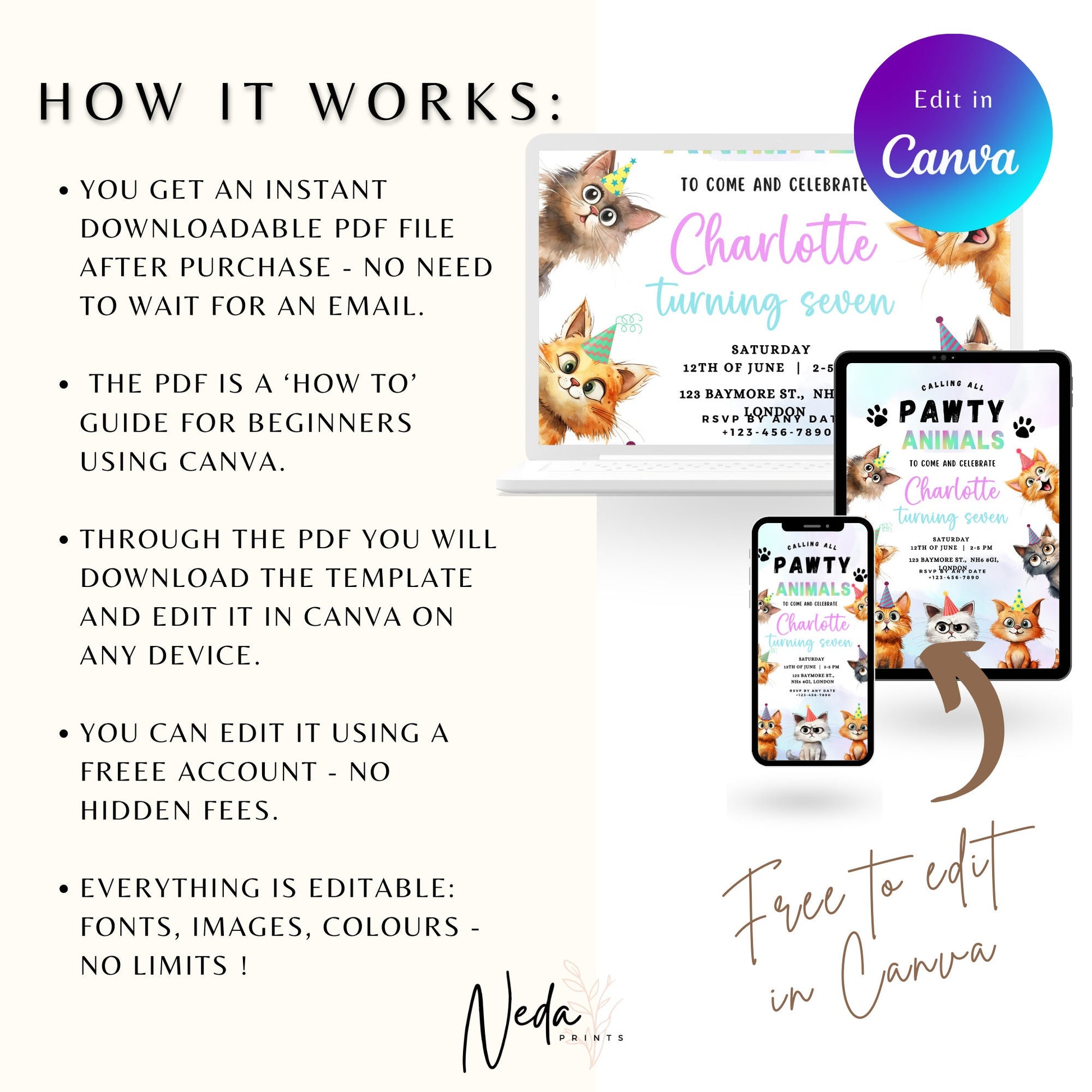 EDITABLE Pawty Animals Birthday Invitation, Cat Birthday Party, Kitten Party Invite, Cat Invitation, Kitty Cat Invite Instant Download I0016