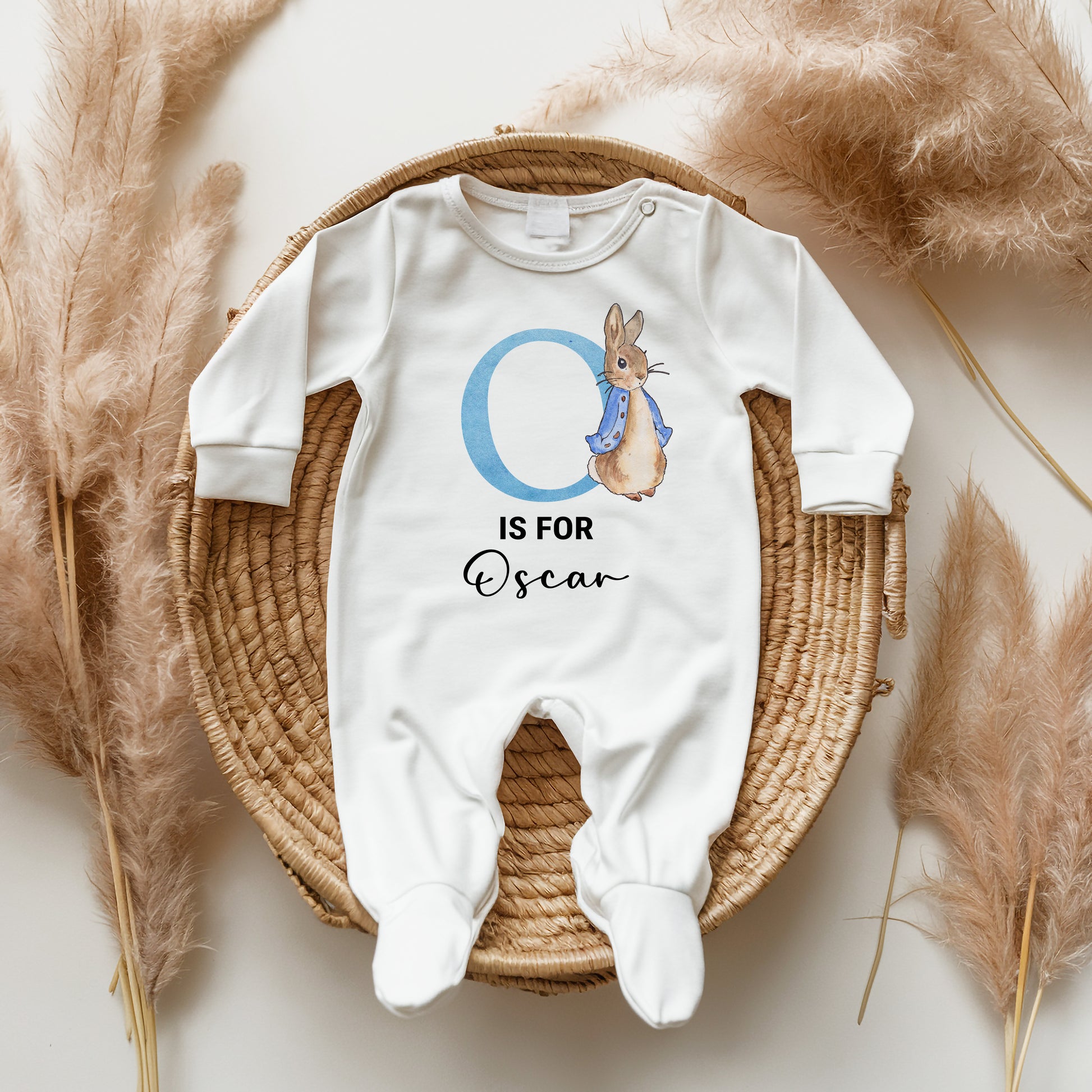 Personalised Blue Rabbit Sleepsuit, Custom Initial Babygrow