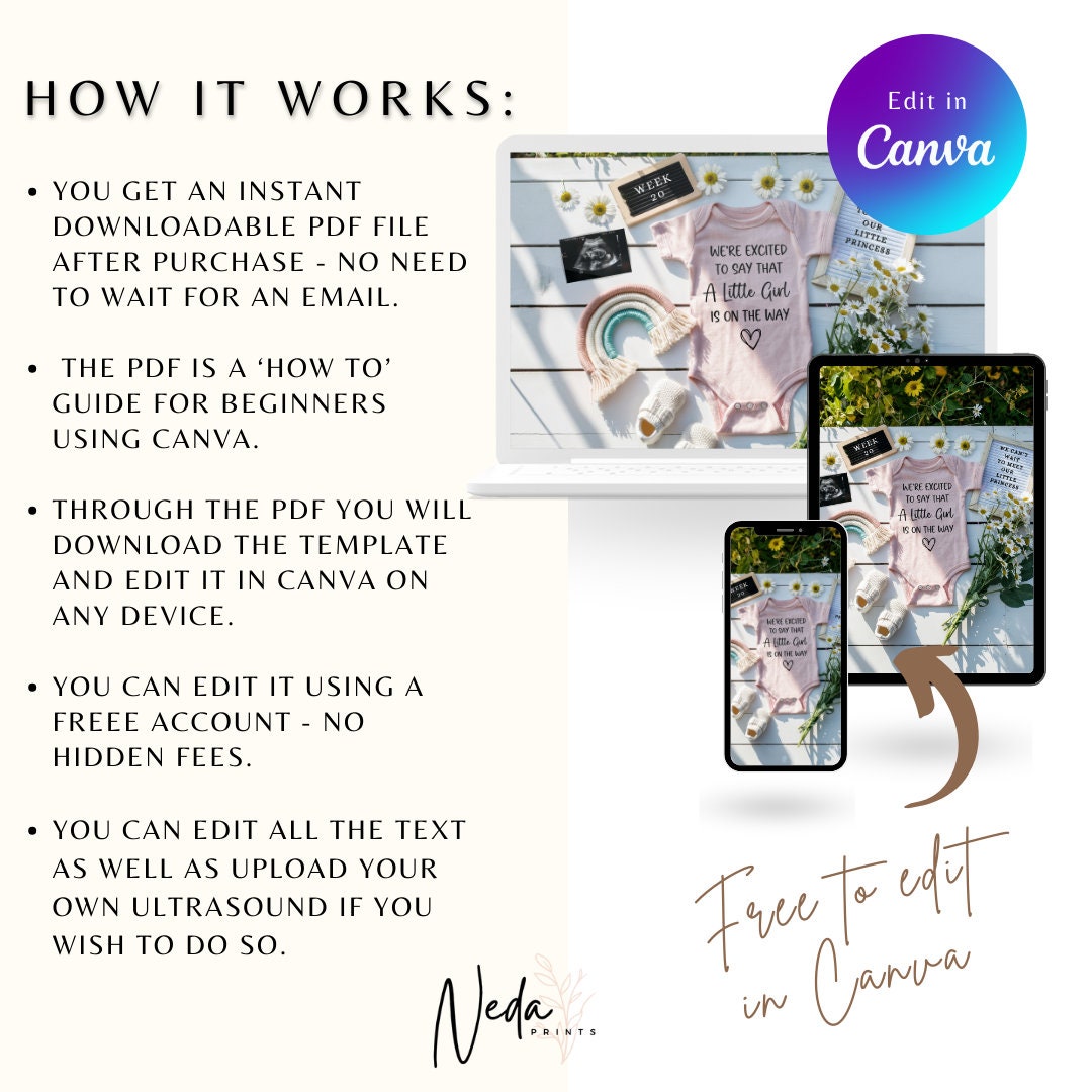 You're pregnant, how exciting!! It's time to share the news with friends and family and this baby announcement mockup is the cutest and quickest way to so. The template is made in Canva so all you need to do is create a free account and your ready to edit your invite.