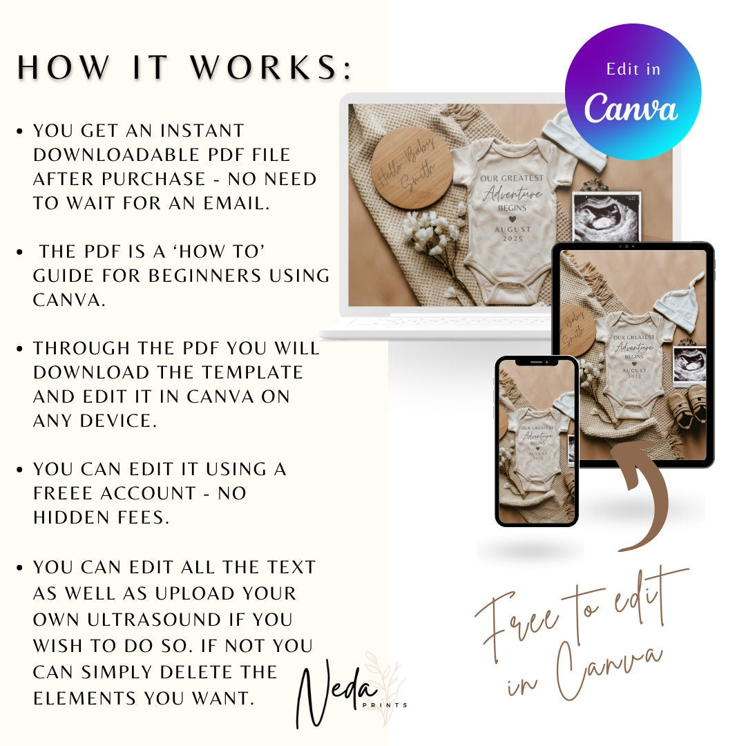 You're pregnant, how exciting!! It's time to share the news with friends and family and this baby announcement mockup is the cutest and quickest way to so. The template is made in Canva so all you need to do is create a free account and your ready to edit your invite.
