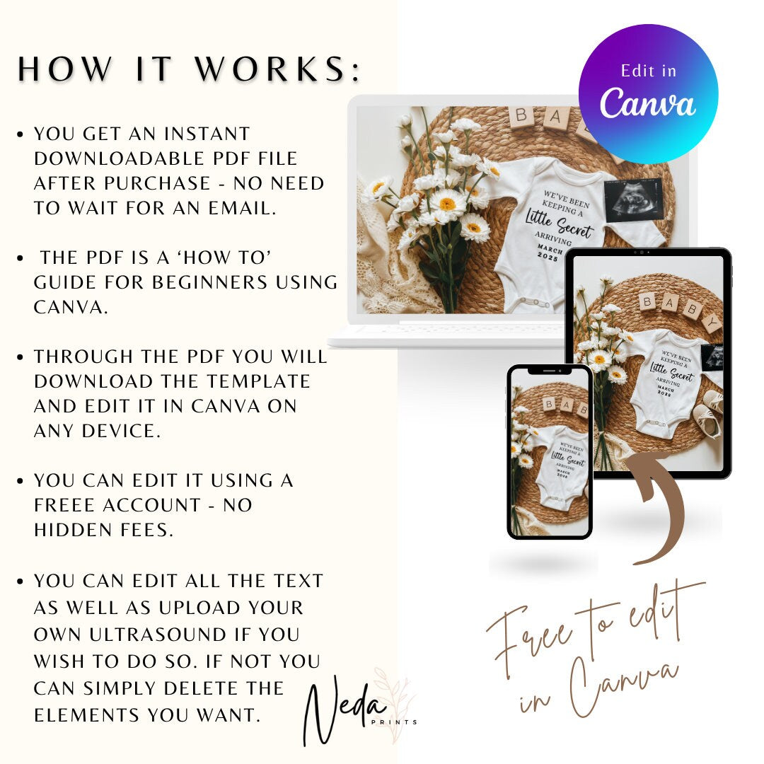 You're pregnant, how exciting!! It's time to share the news with friends and family and this baby announcement mockup is the cutest and quickest way to so. The template is made in Canva so all you need to do is create a free account and your ready to edit your invite.