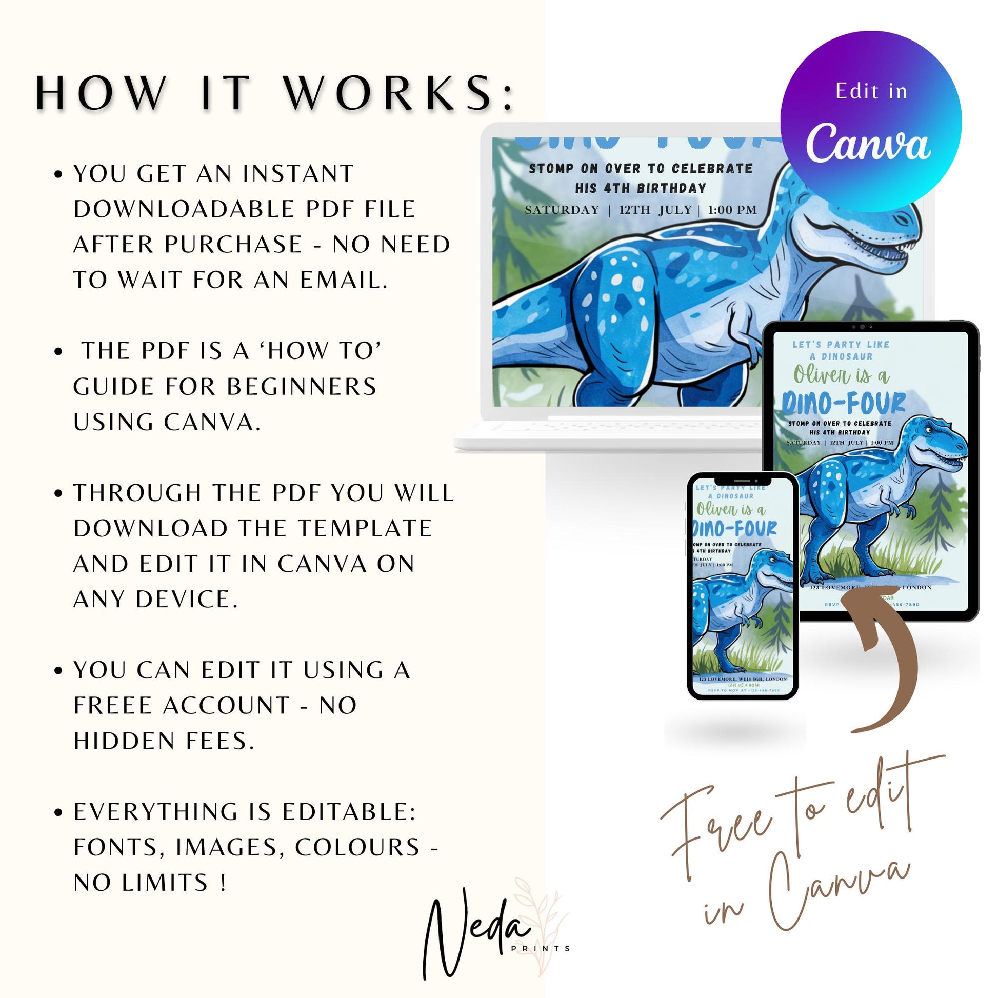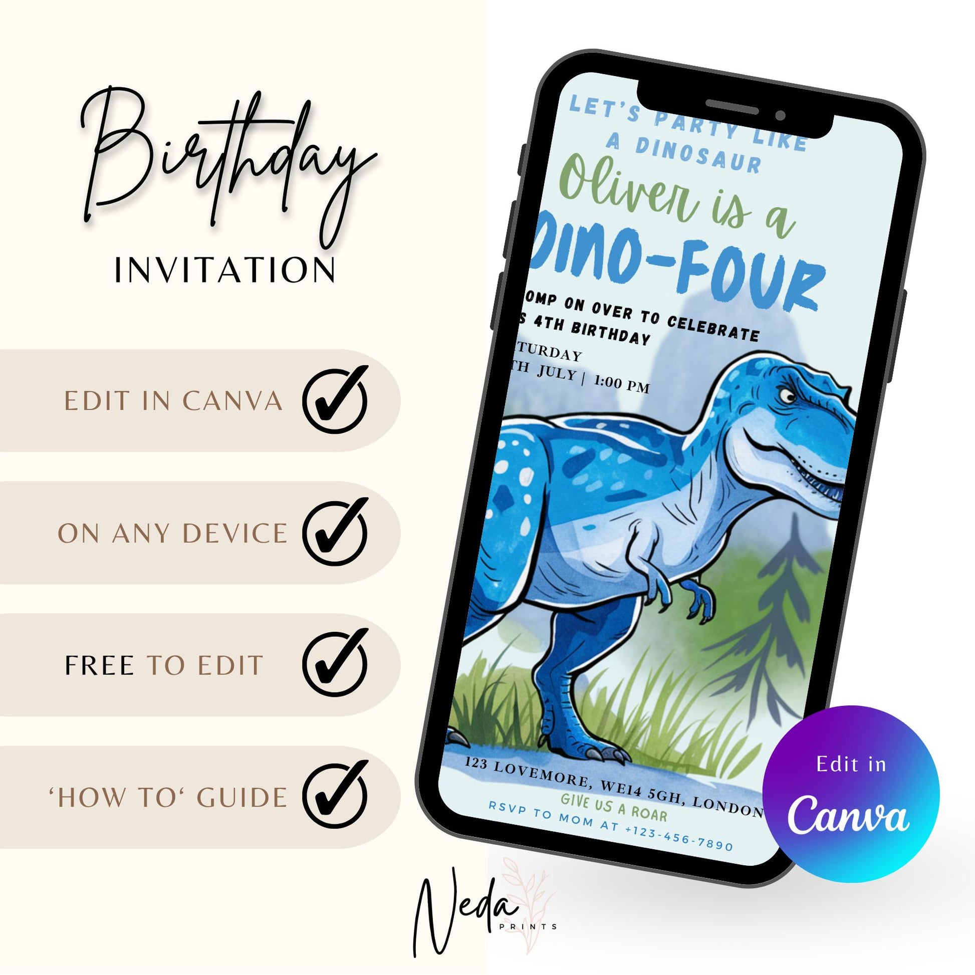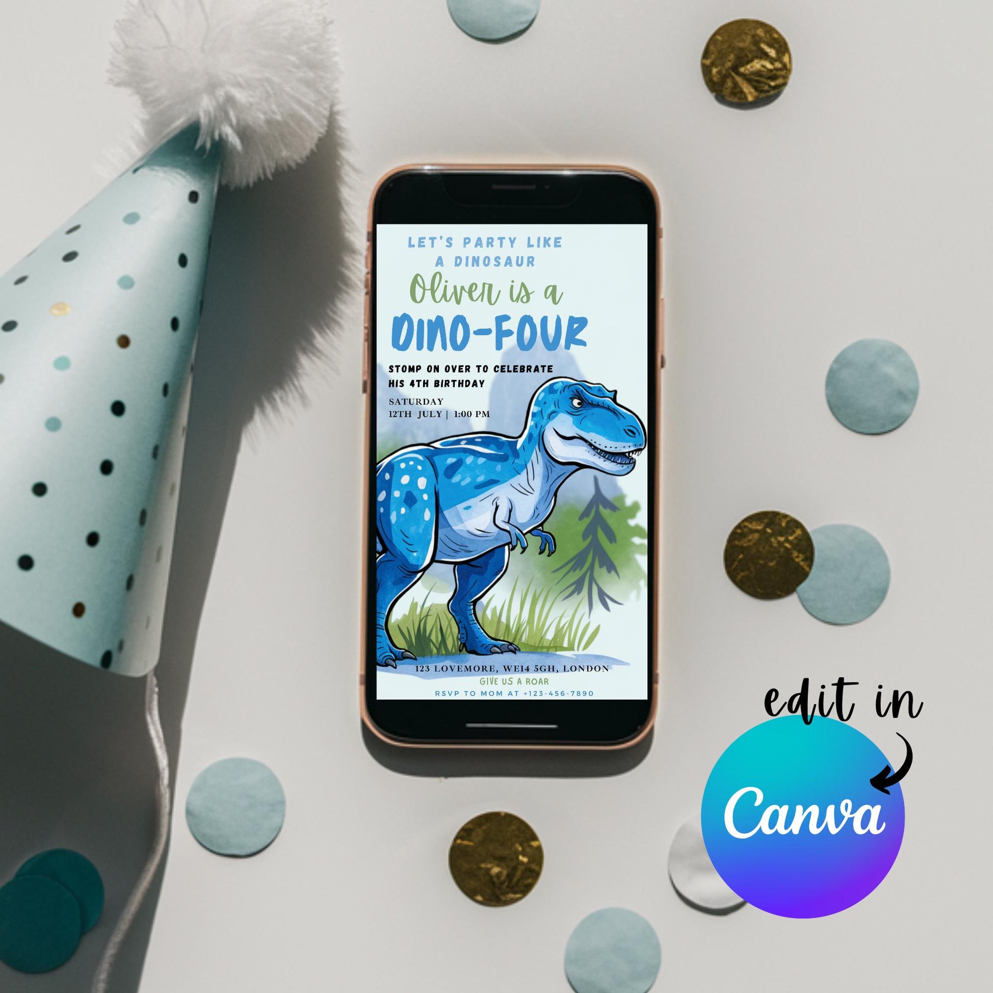 EDITABLE Boy DINO-FOUR Dinosaur Birthday Invitation, 4th dinosaur birthday party Dinosaur Party Invite Fourth dinosaur invite Download I0149