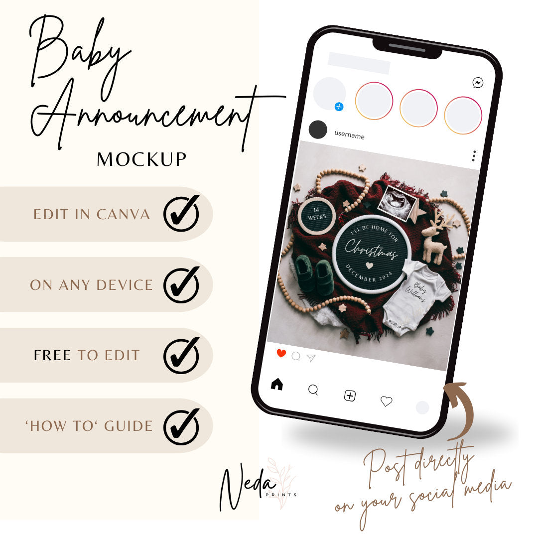 You're pregnant, how exciting!! It's time to share the news with friends and family and this baby announcement mockup is the cutest and quickest way to so. The template is made in Canva so all you need to do is create a free account and your ready to edit your invite.