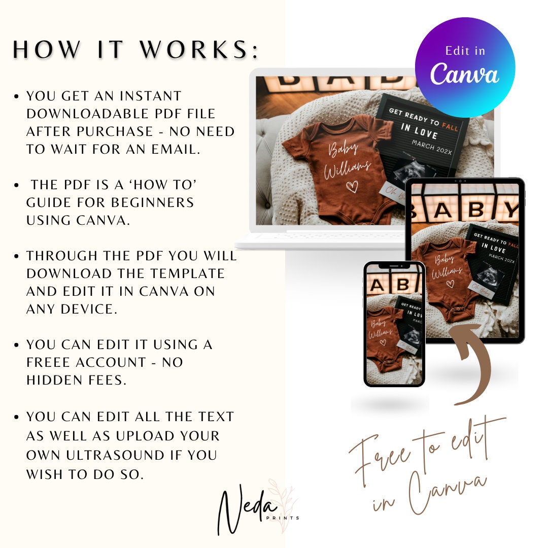 You're pregnant, how exciting!! It's time to share the news with friends and family and this baby announcement mockup is the cutest and quickest way to so. The template is made in Canva so all you need to do is create a free account and your ready to edit your invite.