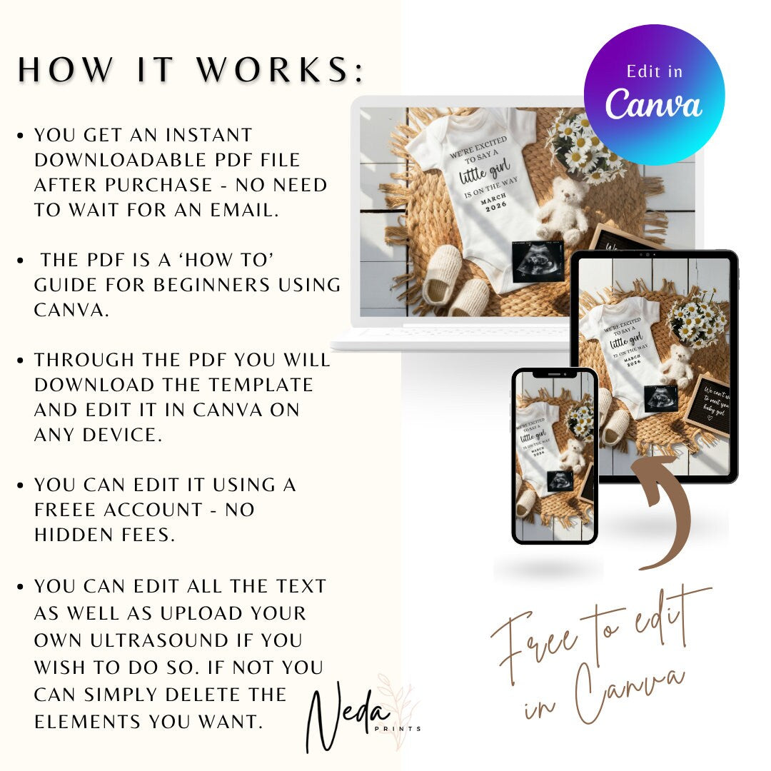 You're pregnant, how exciting!! It's time to share the news with friends and family and this baby announcement mockup is the cutest and quickest way to so. The template is made in Canva so all you need to do is create a free account and your ready to edit your invite.