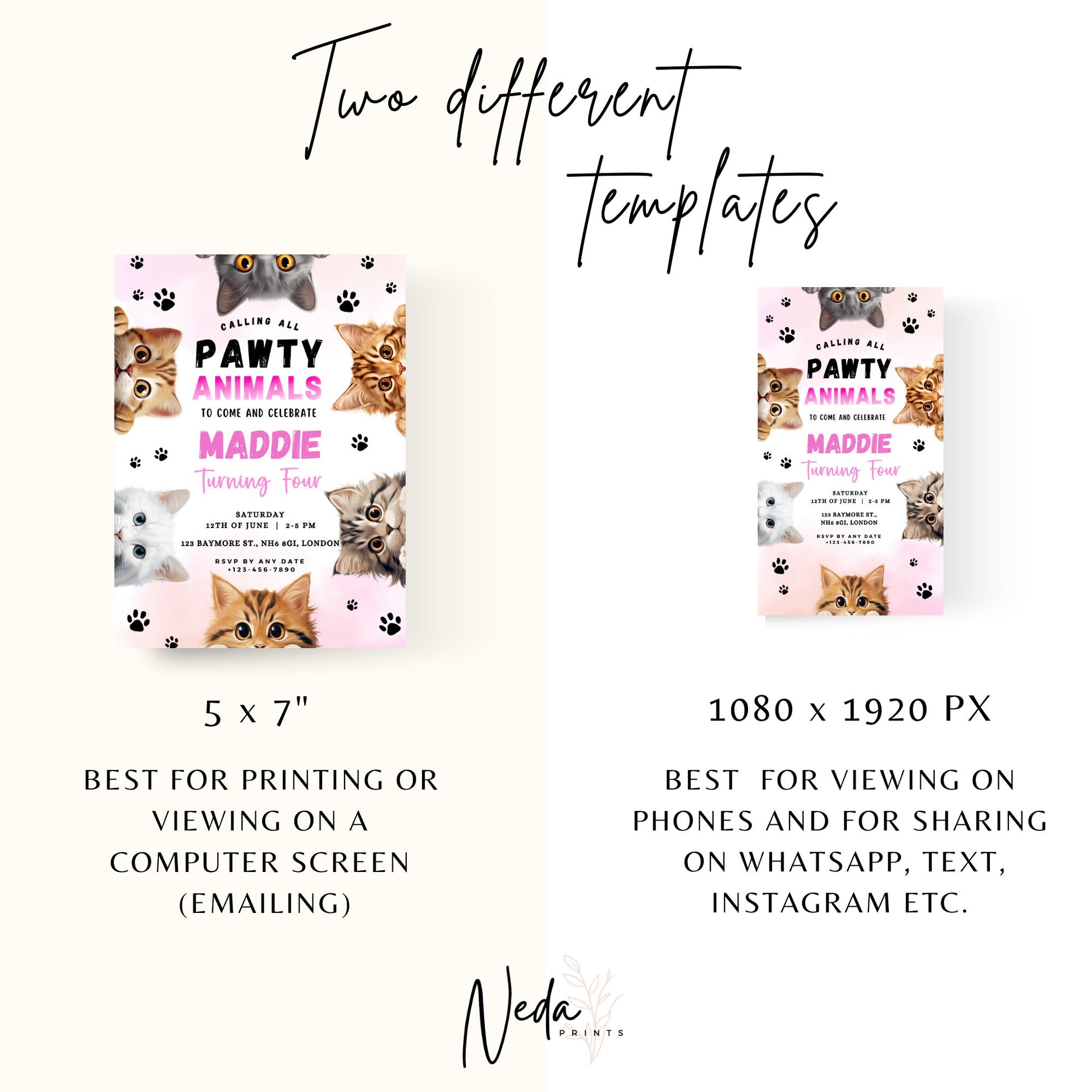 EDITABLE Pawty Animals Birthday Invitation, Cat Birthday Party, Kitten Party Invite, Cat Invitation, Kitty Cat Invite Instant Download I0025