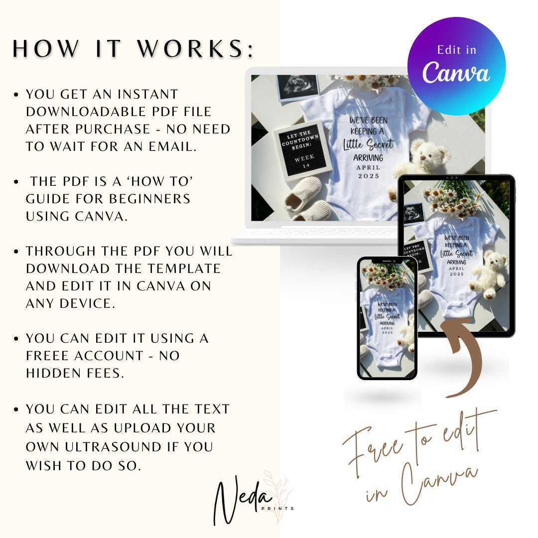 You're pregnant, how exciting!! It's time to share the news with friends and family and this baby announcement mockup is the cutest and quickest way to so. The template is made in Canva so all you need to do is create a free account and your ready to edit your invite.