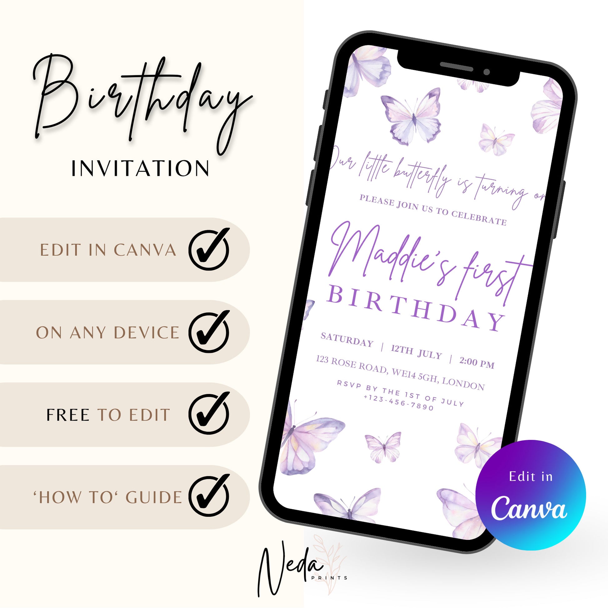 EDITABLE Purple Butterfly Birthday Invitation, 1st Birthday Invite, Butterfly Girl Birthday, Butterfly party, Printable Invitation Template