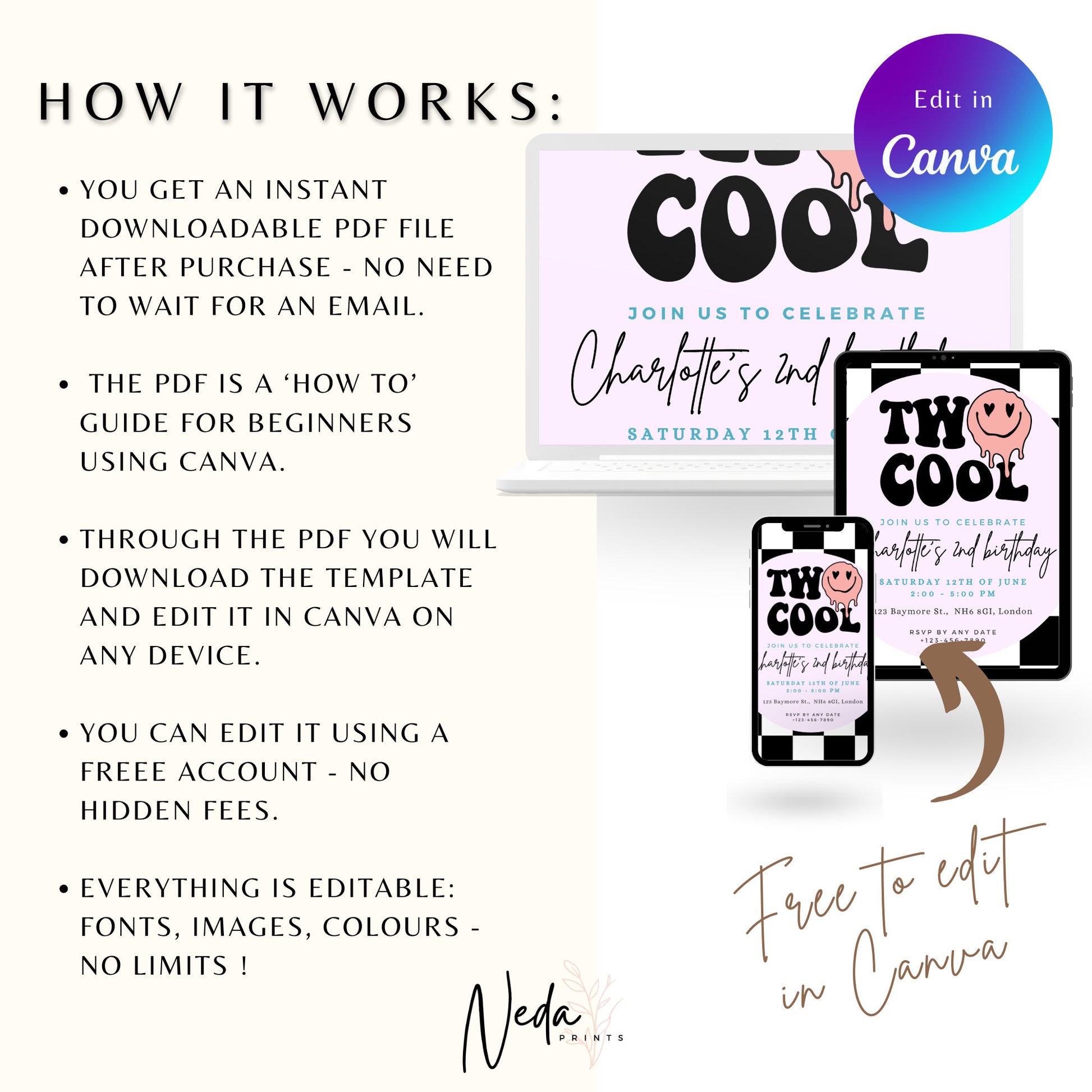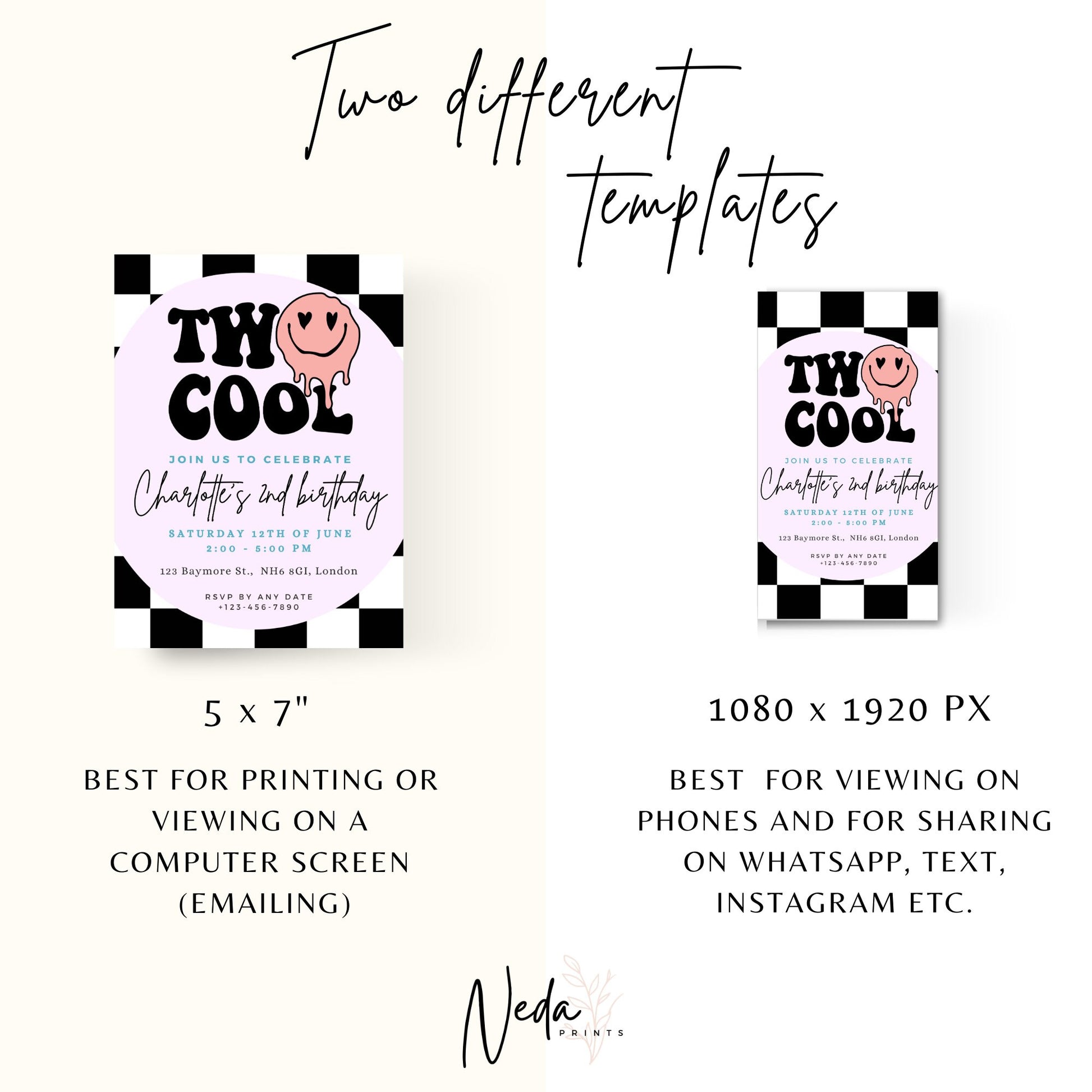 EDITABLE Two Cool Birthday Invitation, Girl 2nd Birthday Invite, Retro birthday, Girl second retro birthday party Printable Instant Download
